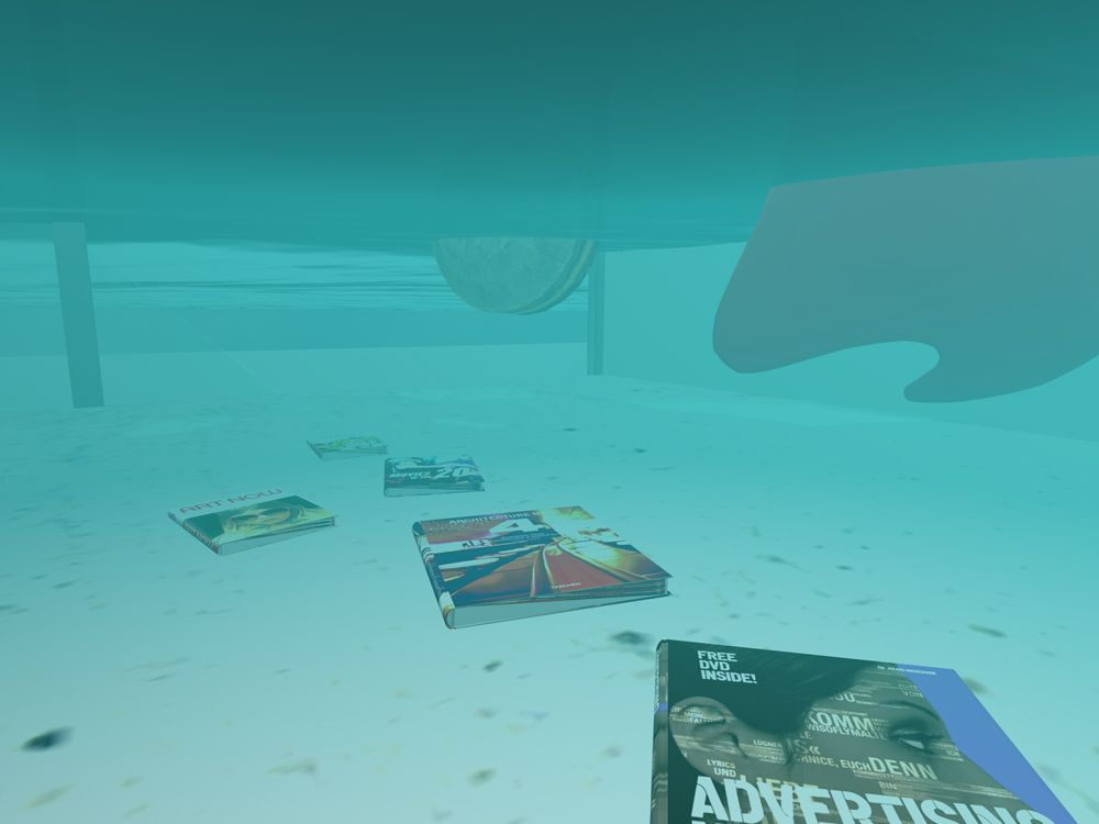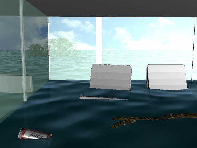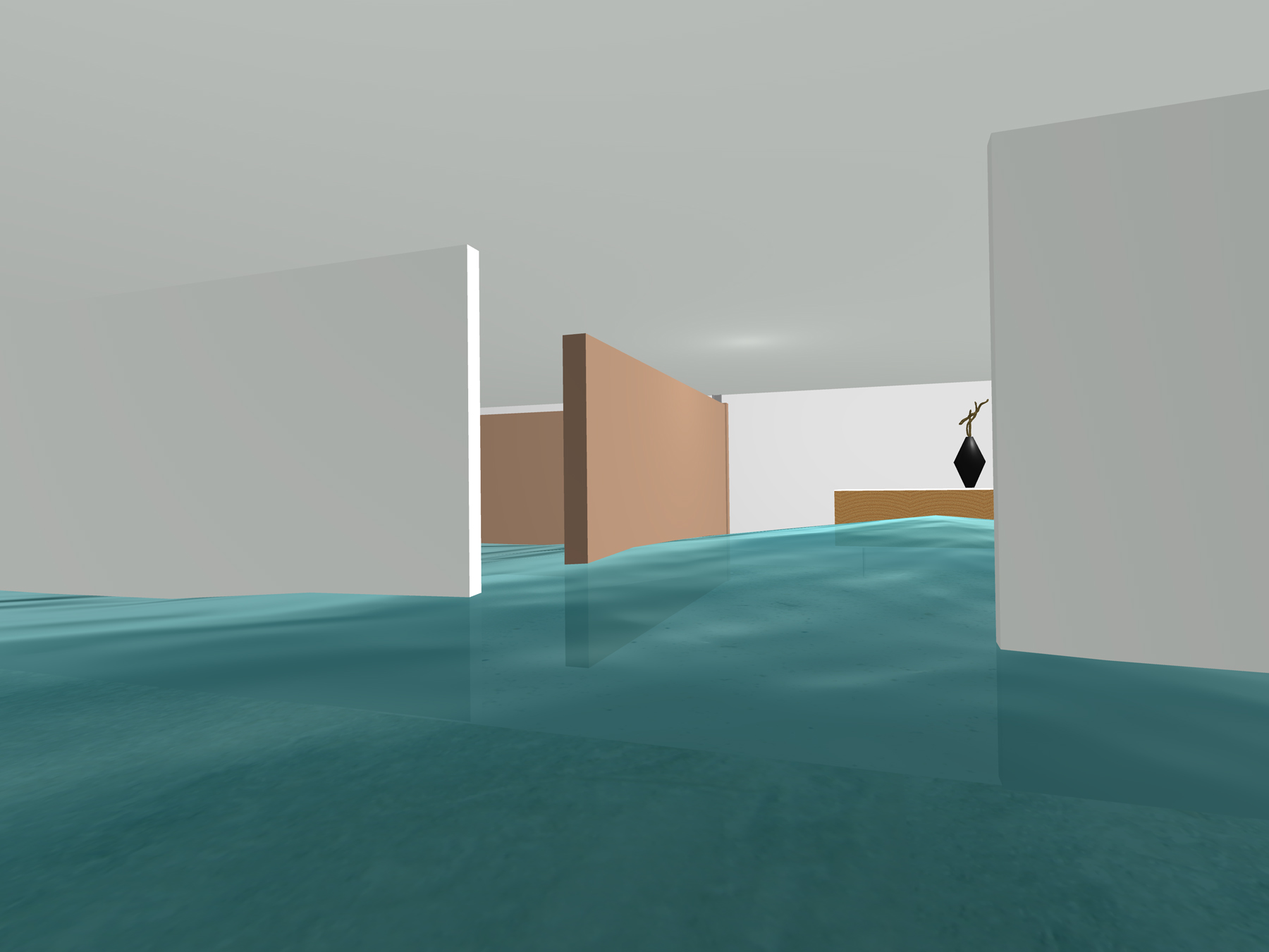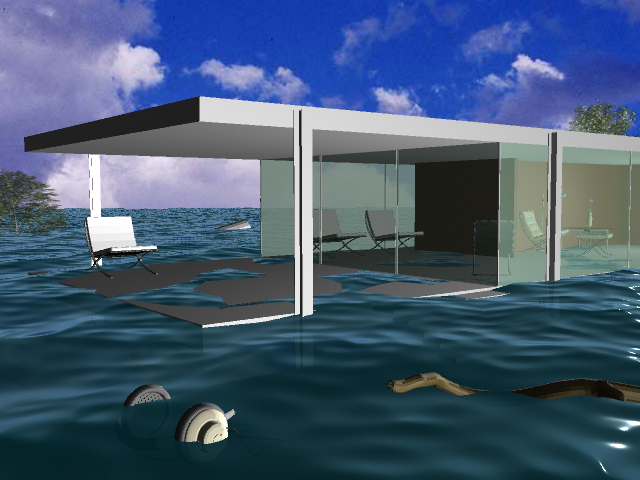 A modernist house, designed by Pierre Koenig, has been rebuilt on an island. The waters rise, and the house, its furnishings, and a plaster frog, slowly make their way out to sea.